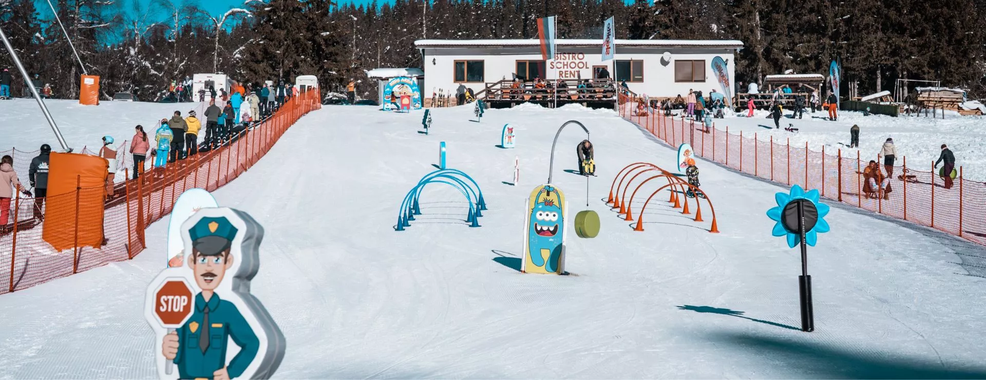 Нашият неповторим Детски парк е проектиран така, че малките скиори да се научат да карат ски, играейки в защитена и интересна среда. С писта, с малък наклон, цветни препятствия и приятелски настроени инструктори, децата могат да придобият самочувствие на снега, играейки различни игри, преминавайки през арки и интересни фигури на герои. Това е перфектното място, където децата да опознаят склоновете, съобразявайки се със собствените си възможности.
